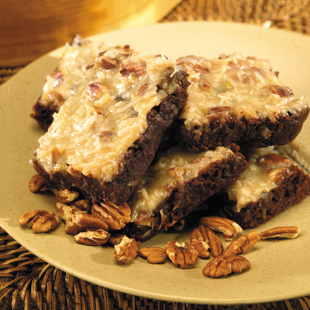A stylized studio photograph of a pile of homemade brownies with coconut cream and pecan frosting resting on a yellow plate with some more walnuts as a garnish.