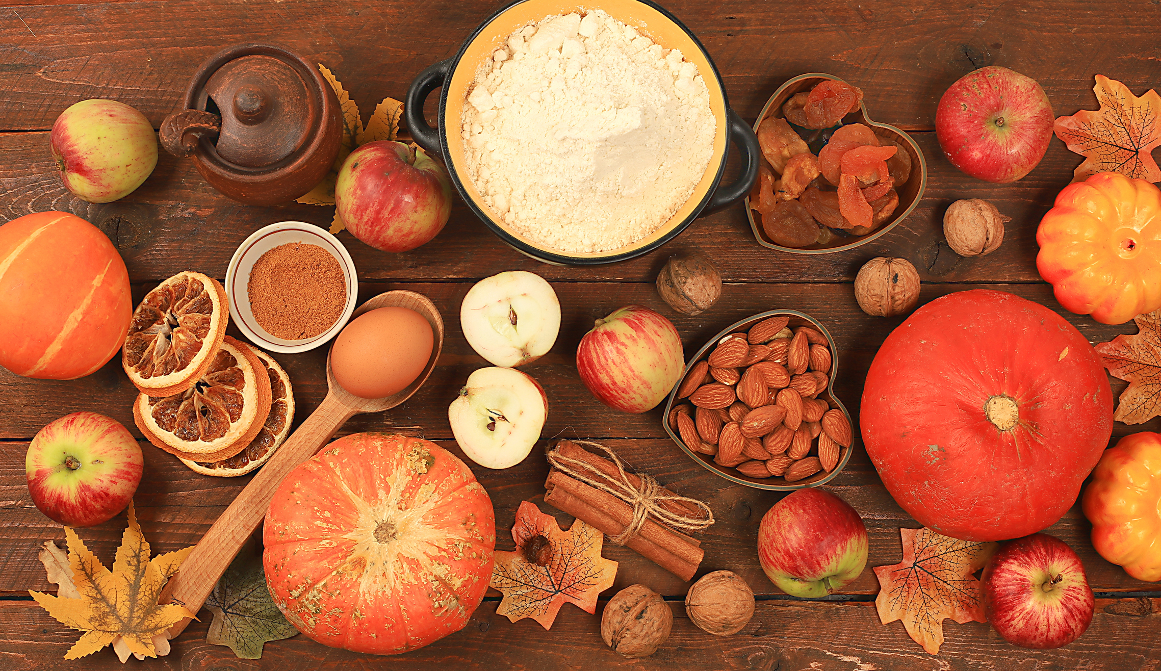 Kitchen background with pumpkin, apples, spices, nuts, flour, eggs, food preparation concept, ingredients for pumpkin and apple pies recipe, menu for restaurant, selective focus, top view,