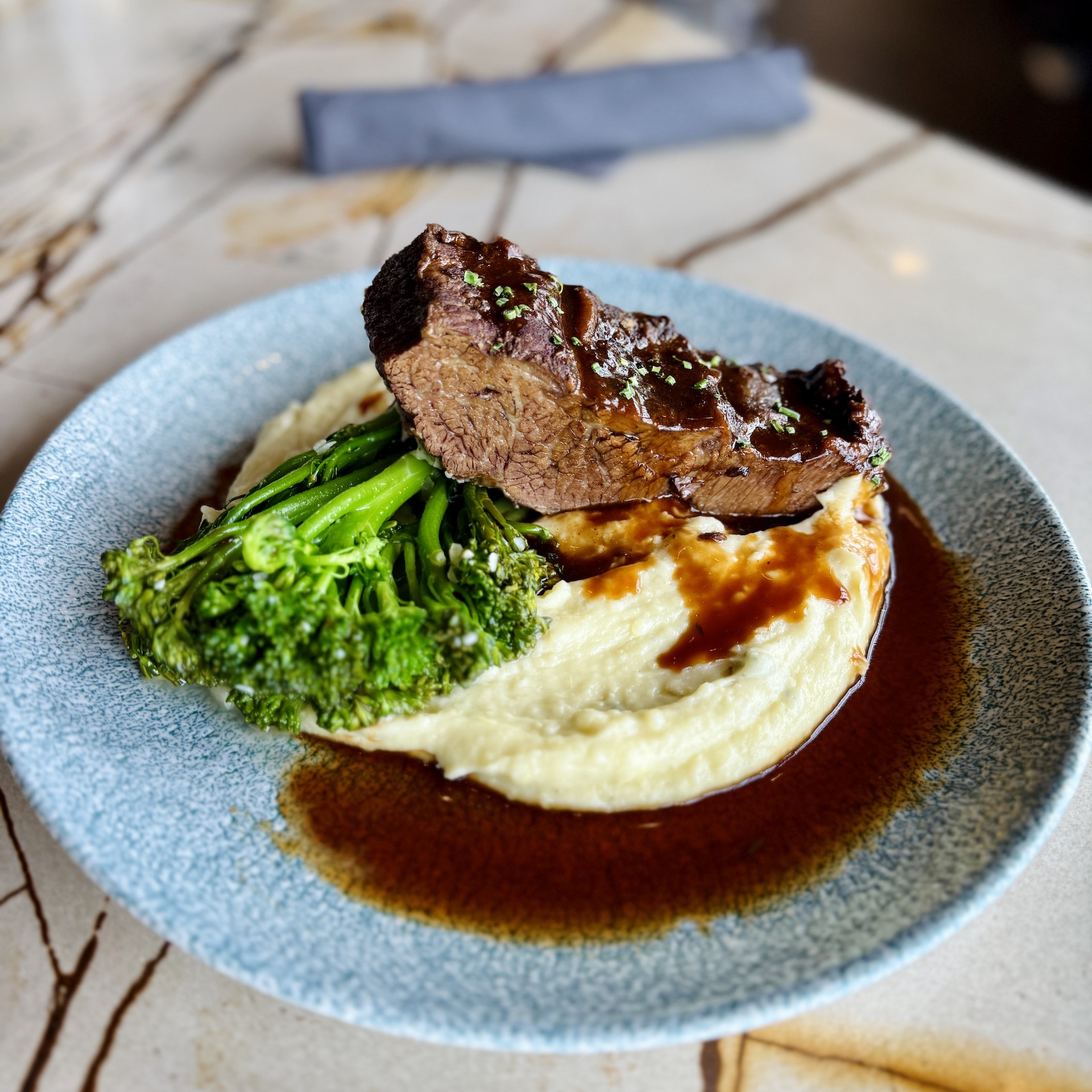slow-braised Angus short ribs, gorgonzola whipped potatoes, charred carrots, red wine demi-glace
